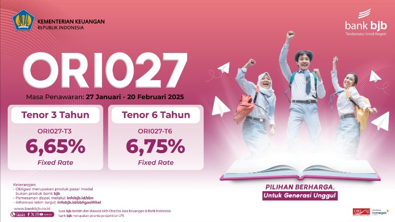 Saat ini, pemerintah telah membuka masa penawaran ORI027, yang dapat dibeli melalui berbagai agen distribusi, termasuk bank bjb. ORI027 hadir dengan dua pilihan tenor, yaitu 3 tahun dengan kupon 6,65% fixed rate dan 6 tahun dengan kupon 6,75% fixed rate.