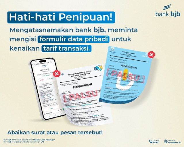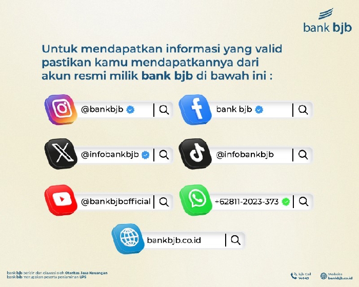 “Kami mengimbau agar nasabah selalu memastikan bahwa informasi yang mereka dapatkan berasal dari sumber atau kanal informasi resmi bank bjb seperti website resmi www.bankbjb.co.id, media sosial resmi yang verified Instagram @bankbjb, Facebook bank bjb, X (ex Twitter) @infobankbjb, TikTok @infobankbjb, YouTube @bankbjbofficial, Whatsapp verified +62811-2023-373, email bjbcare@bankbjb.co.id, call center resmi bjb Call 14049. Jangan mudah percaya pada informasi yang didapatkan dari sumber yang tidak jelas, apalagi jika diarahkan untuk mengisi data pribadi melalui link yang diberikan oleh pihak yang tidak dikenal,” kata Widi.