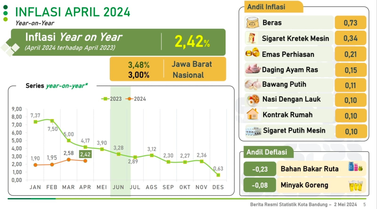 Bandung, sekilasjabar.co – Badan Pusat Statistik (BPS) Kota Bandung merilis Perkembangan Indeks Harga Konsumen Kota Bandung April 2024. Hasilnya, pada April 2024 terjadi inflasi Year on Year (YoU) Kota Bandung sebesar 2,42 persen.