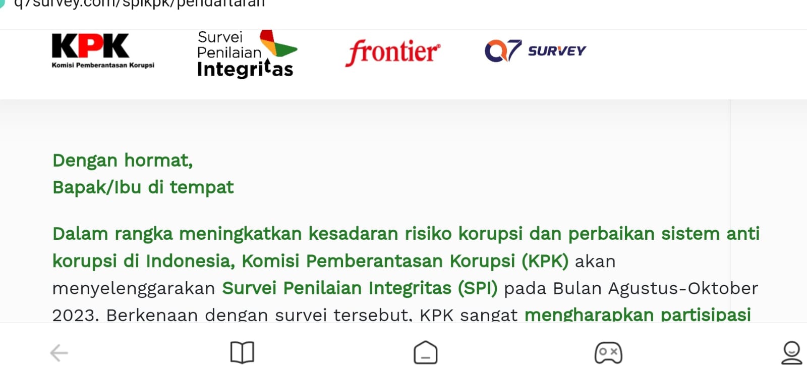 Untuk mengisi survei hanya butuh waktu antara 5-15 menit. Identitas dan kerahasiaan jawaban responden dilindungi oleh KPK.