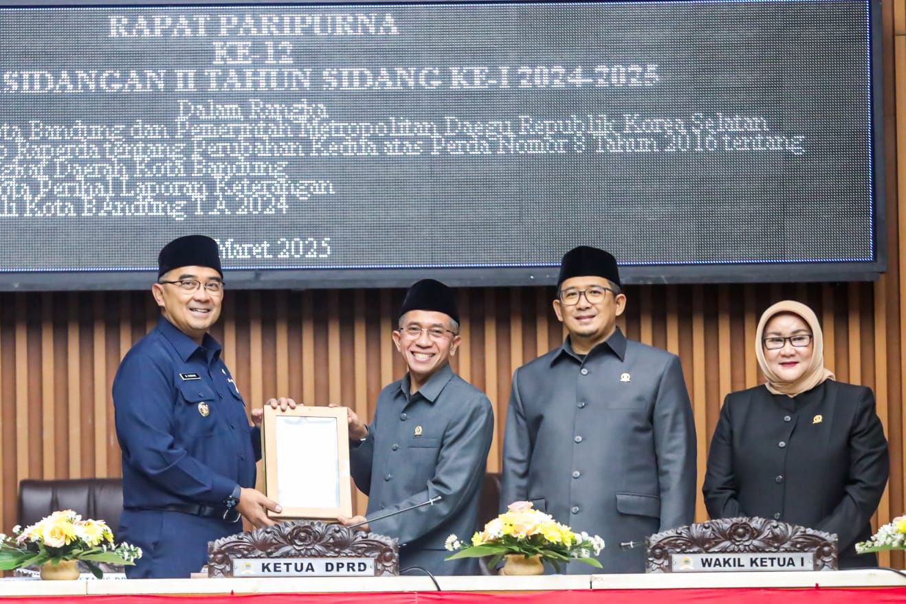 Rapat Paripurna diakhiri dengan penandatanganan berita acara persetujuan persetujuan kerja sama antara Pemerintah Kota Bandung dengan Pemerintah Kota Daegu, Korea Selatan, perubahan susunan perangkat daerah, dan penyampaian Laporan Keterangan Pertanggungjawaban (LKPJ) Wali Kota Bandung Tahun 2024.