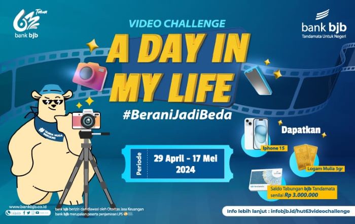 Program Video Challenge “A Day In My Life” berlangsung mulai tanggal 29 April hingga 17 Mei 2024. Untuk informasi lebih lanjut, Sahabat dapat mengakses akun Instagram resmi bank bjb @bankbjb atau mengunjungi situs web resmi bank bjb www.bankbjb.co.id (infobjb.id/hut63videochallenge). (red)