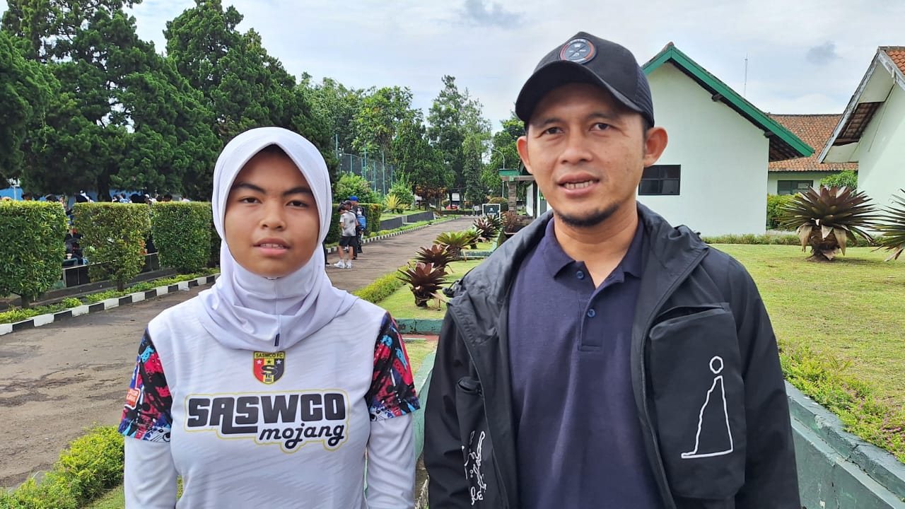 Pemain Saswco Mojang U-15, Aqilla Davina Putri, bersama ayahnya, Airlangga Sutjipto yang merupakan mantan pemain Persib Bandung. (Fifi Nofita)