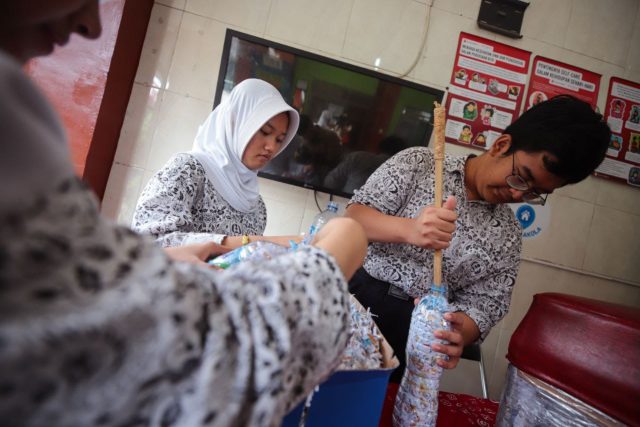 “Ada 16 kelas di sini, jadi dalam seminggu, anak-anak kami tugaskan untuk mengumpulkan sampah botol plastik dan sampah yang tidak bisa didaur ulang untuk diisi ke dalam botol plastik. Hasilnya ya satu ecobricks ini,” bebernya.