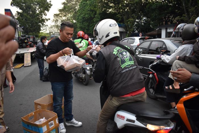 Seperti sebelumnya, sebanyak 500 paket makanan siap santap yang disediakan PWI dan Ikatan Keluarga Wartawan (IKWI) Kota Bandung dalam hitungan menit habis tersalurkan kepada warga pengguna jalan yang tepat di seberang Kantor PWI Kota Bandung.