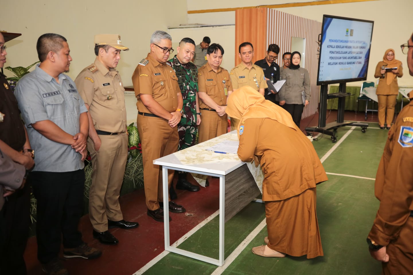 Penandatanganan ini dipimpin langsung oleh Wali Kota Bandung, Muhammad Farhan, dengan dihadiri para kepala sekolah dari seluruh jenjang satuan pendidikan negeri mulai dari Sanggar Kegiatan Belajar (SKB), TK Negeri, SD Negeri, hingga SMP Negeri serta perwakilan Forkopimda Kota Bandung, termasuk unsur TNI, Polri, dan Kejaksaan Negeri.