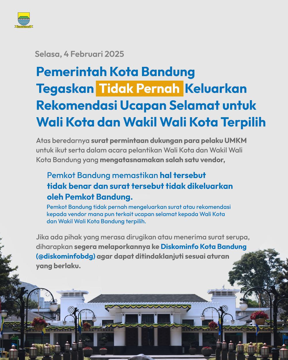 “Kami ingin mengklarifikasi bahwa Pemkot Bandung tidak pernah mengeluarkan surat atau rekomendasi kepada vendor mana pun terkait ucapan selamat kepada Wali Kota dan Wakil Wali Kota Bandung terpilih. Informasi yang beredar saat ini tidak benar dan tidak dapat dipertanggungjawabkan,” tegas Kepala Dinas Komunikasi dan Informatika Kota Bandung, Yayan A. Brilyana, Selasa, 4 Februari 2025.