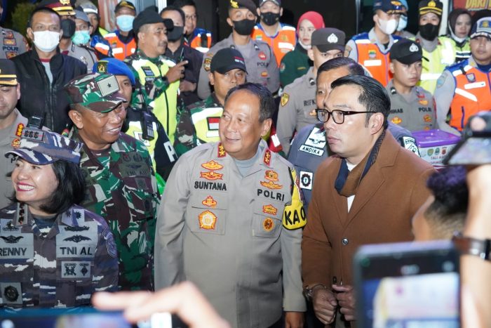 Bandung, sekilasjabar.co – Kapolda Jabar Irjen Pol Drs. Suntana, M.Si. bersama dengan Gubernur Jabar, Kasdam III Siliwangi, Kadensus 88 Polri, Dan Kogartap II Bandung, Dan Lanal Bandung, Wakajati Jabar, Wakapolda Jabar, Pejabat Utama Polda Jabar, Kadishub Jabar melaksanakan Kegiatan peninjauan kesiapan pengamanan di Pospam tempat berkumpulnya masyarakat yang akan melaksanakan kegiatan malam tahun baru di beberapa titik kumpul seperti di Jl.Asia Afrika, Jl.Ir.H.Djuanda (Dago), Depan Gedung Sate Kota Bandung, Sabtu (31/12/2022).