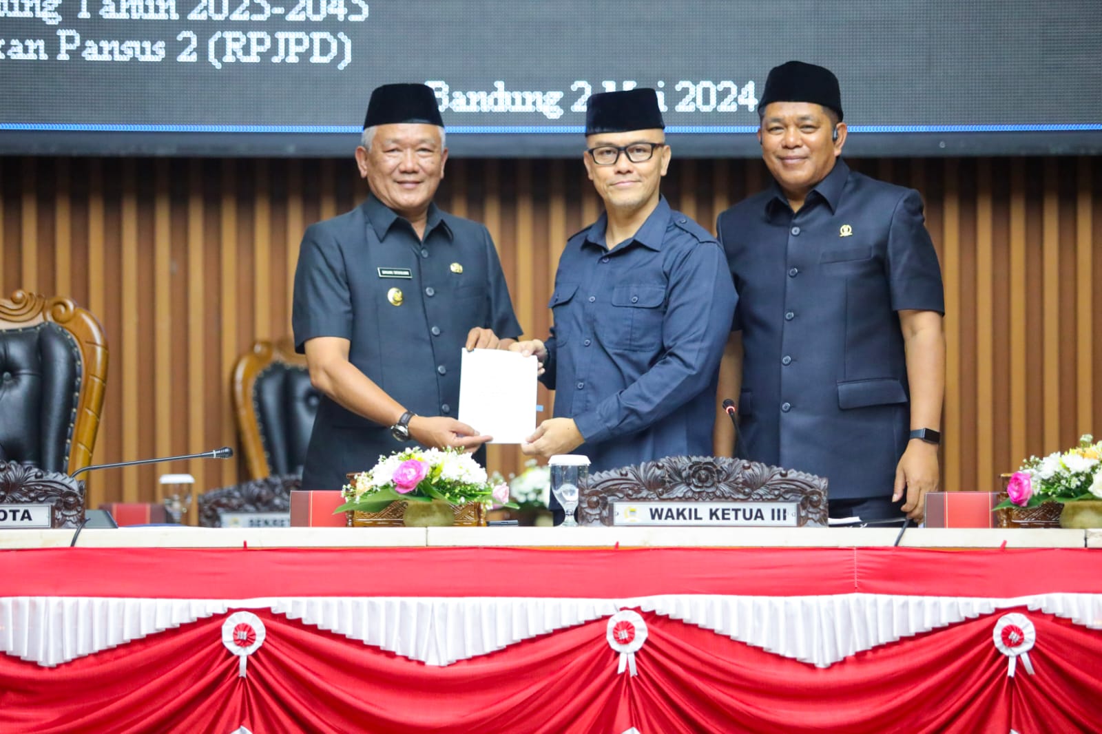 Bandung, sekilasjabar.co – Penjabat Wali Kota Bandung, Bambang Tortoyuliono menyampaikan jawaban atas Pandangan Umum Fraksi terhadap Rancangan Peraturan Daerah (Raperda) tentang Rencana Pembangunan Jangka Panjang Daerah (RPJPD) Kota Bandung Tahun 2025-2045 secara tertulis kepada Wakil Ketua III DPRD Kota Bandung, Edwin Senjaya pada Rapat Paripurna Ke-III di Gedung DPRD Kota Bandung, Jalan Sukabumi No. 30, Kamis, 2 Mei 2024.