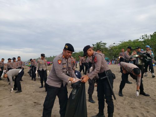 Pangandaran, sekilasjabar.co – Polres Pangandaran Polda Jabar membersihkan sampah yang berserakan di pesisir Pantai Barat Pangandaran, Sabtu (11/2/2023).