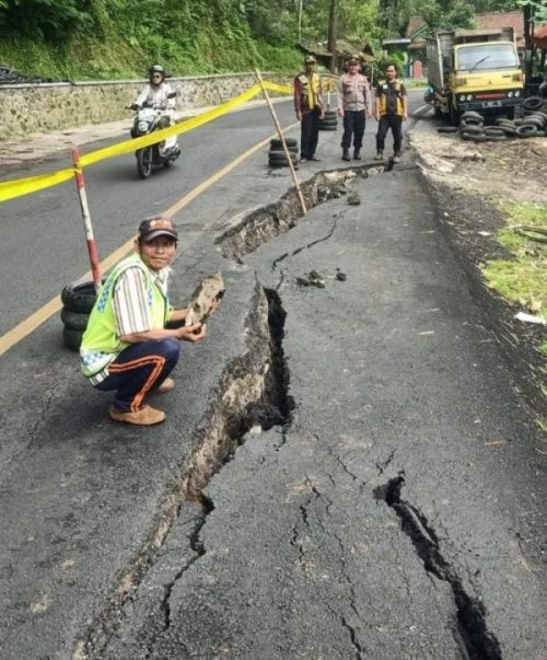 Tanah amblas sepanjang 18 m tinggi 50 cm lebar 1,5 m yang Mengakibatkan Terhambatnya Arus lalu lintas. Bencana alam tanah longsor itu terjadi pada Jum’at, (9/12/2022) dini hari.