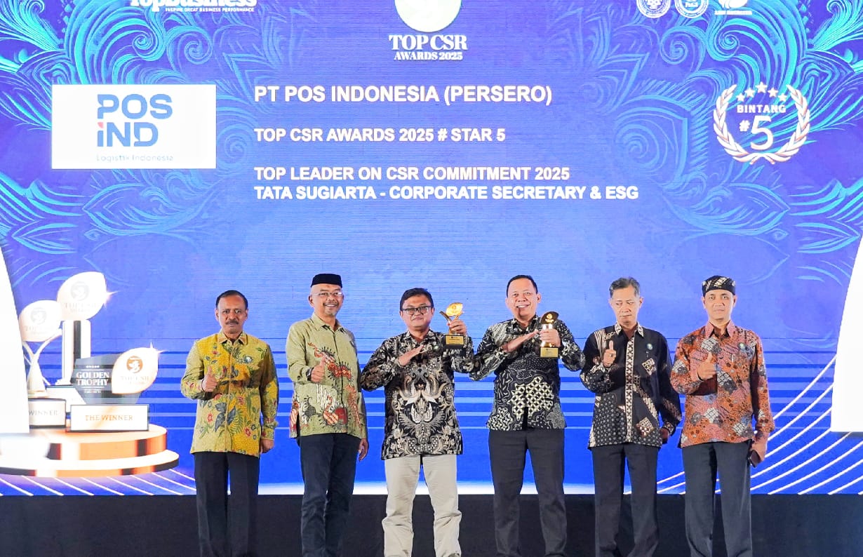 Bandung, sekilasjabar.co – PT Pos Indonesia (Persero) kembali menorehkan prestasi gemilang dalam bidang Tanggung Jawab Sosial dan Lingkungan (TJSL) dengan meraih penghargaan TOP CSR Awards 2025 #Star 5, serta penghargaan khusus TOP Leader on CSR Commitment 2025 untuk Bapak Tata Sugiarta selaku Corporate Secretary & SEG PT Pos Indonesia (Persero).