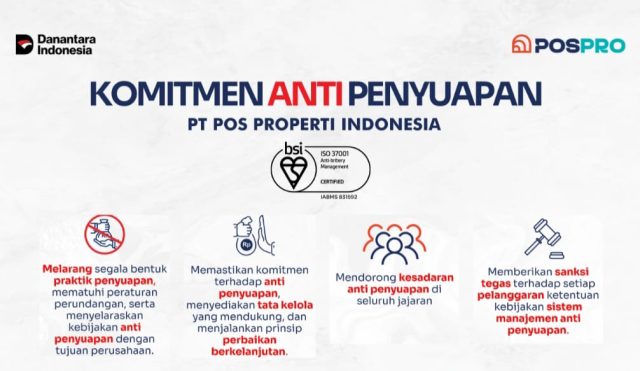 Sebagai bukti konkret, PT Pos Properti Indonesia telah berhasil memperoleh sertifikasi ISO 37001:2016 terkait Sistem Manajemen Anti Penyuapan (SMAP).
