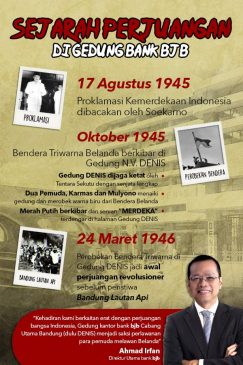 “Kehadiran kami berkaitan erat dengan perjuangan bangsa Indonesia. Gedung kantor bank bjb Cabang Utama Bandung menjadi saksi perlawanan para pemuda melawan Belanda dalam upayanya mempertahankan kemerdekaan. Untuk itu, kami mengajak masyarakat untuk bersama menghargai jasa para pendahulu. Isi kemerdekaan dengan hal positif dan bermanfaat,” ujar Direktur Utama bank bjb Ahmad Irfan beberapa waktu lalu.