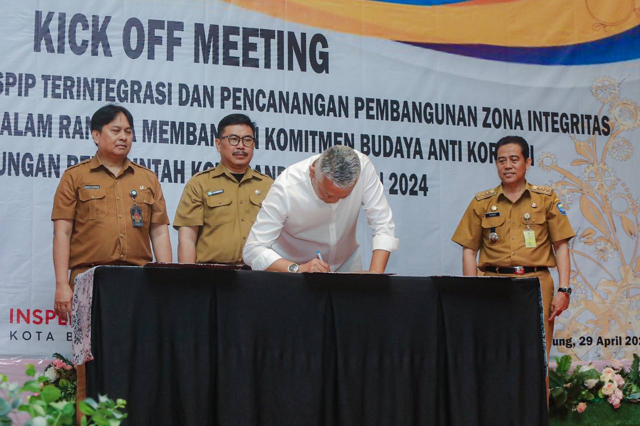 Bandung, sekilasjabar.co – Untuk mewujudkan Pemerintah yang berintegritas tinggi serta bebas korupsi, kolusi, dan nepotisme (KKN) Pemerintah Kota Bandung menggelar Penandatanganan Pakta Integritas dan Komitmen Bersama Pemerintah Kota Bandung dalam Kick Off Meeting Penyelenggaraan Maturitas Sistem Pengendalian Intern Pemerintah (SPIP) Terintegrasi dan Pencanangan Pembangunan Zona Integritas Menuju WBK/WBBM diikuti oleh seluruh Perangkat Daerah di Grandia Hotel, Senin 29 April 2024.